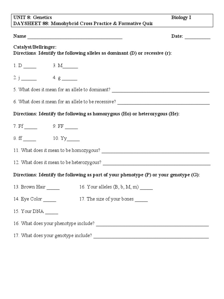 Aman heterozygous for dimples marries a woman who is also heterozygous for dimples monohybrid cross answer key. Monohybrid cross worksheet answers homeschooldressage com.